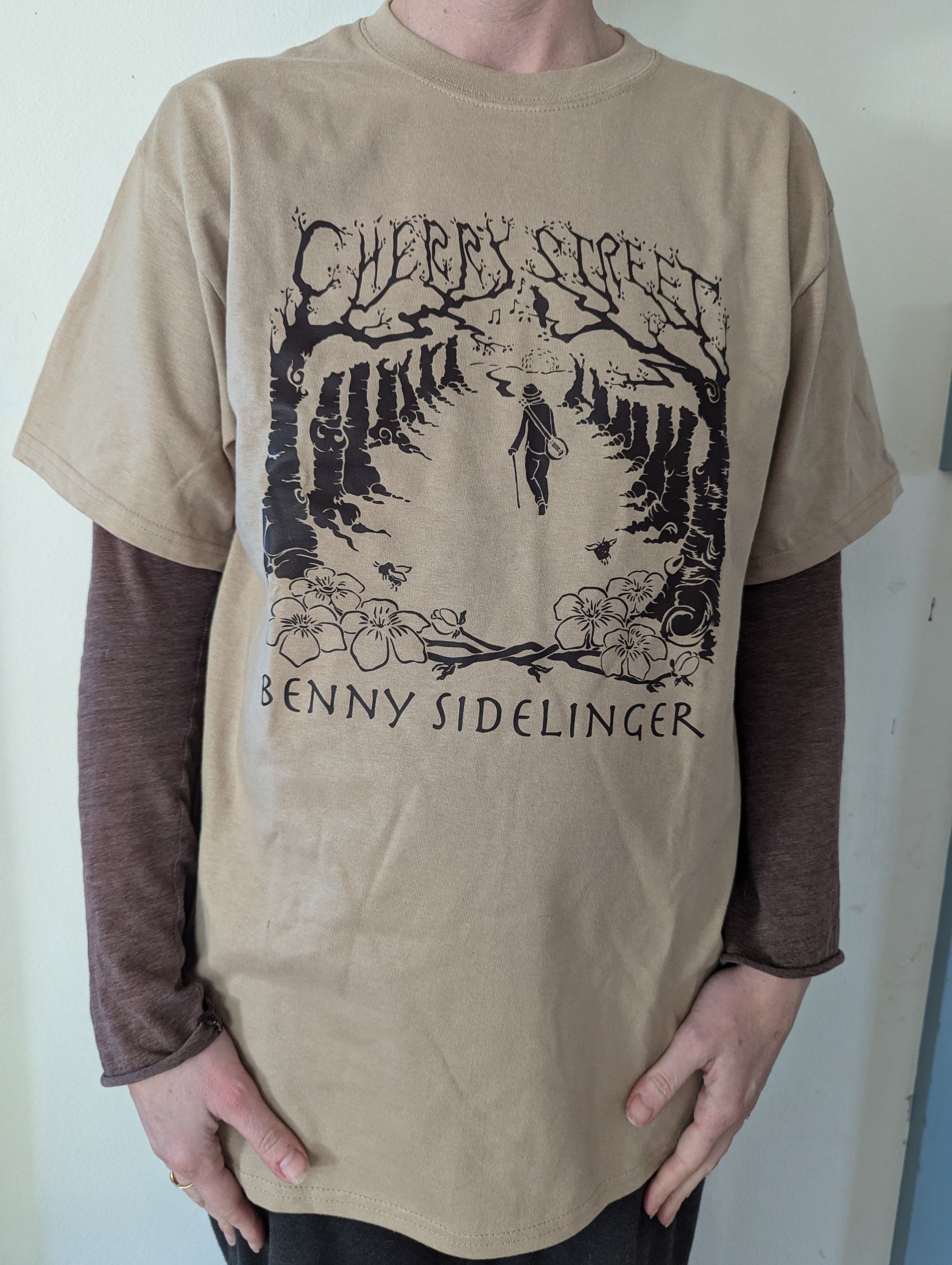 Printed on a super comfortable Port & Company T, these shirts will be an instant favorite. The high quality screen print done by a local veteran printer will hold up to all the abuse you can throw at it. The custom artwork seals your place in history, celebrating the first solo album from Benny Sidelinger "Cherry Street".