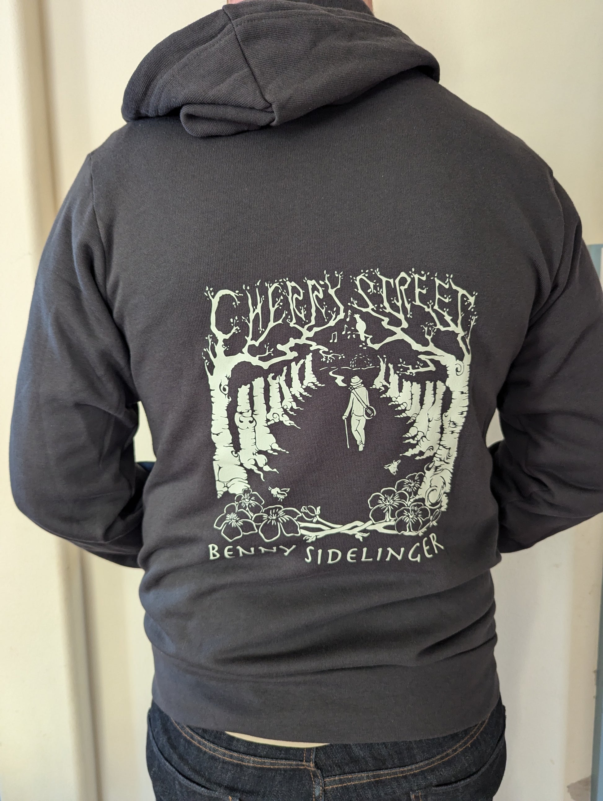 Printed on the Bella & Canvas fleece hoodie, this will be the most comfortable sweatshirt you own. The high quality screen print done by a local veteran printer will hold up to all the abuse you can throw at it. The custom artwork seals your place in history, celebrating the first solo album from Benny Sidelinger "Cherry Street".